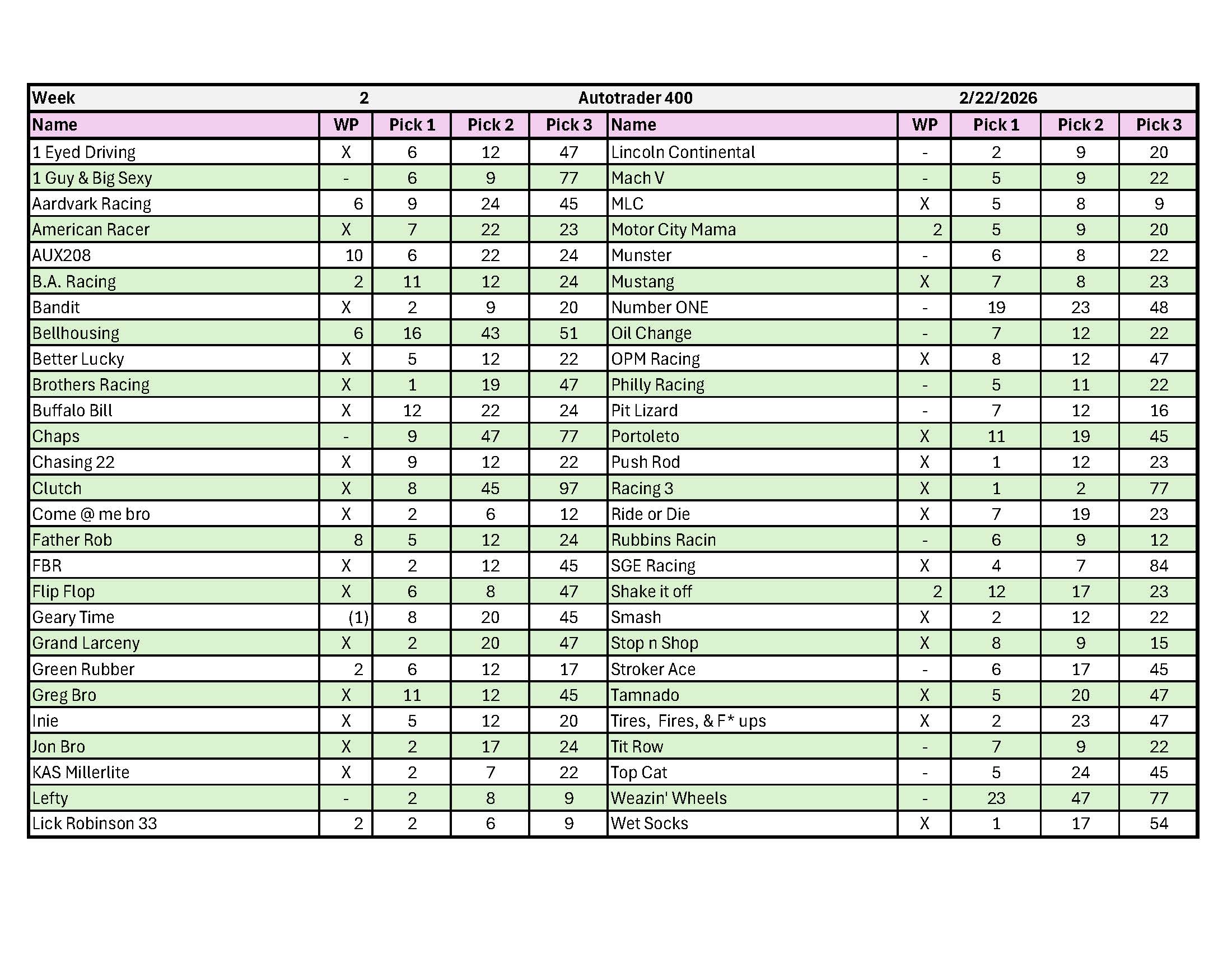 Driver Pick Sheet