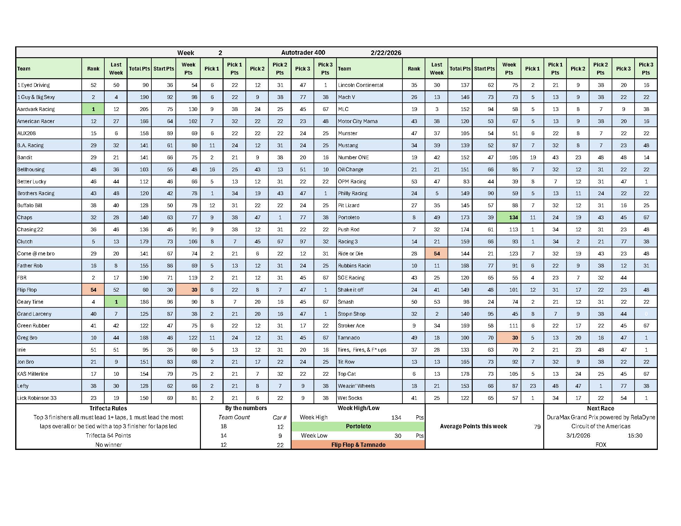 Week 2 Results – Atlanta Feb 23, 2026 | Results Phoenix – Week 36 Download/Print Winners Pool Download/Print