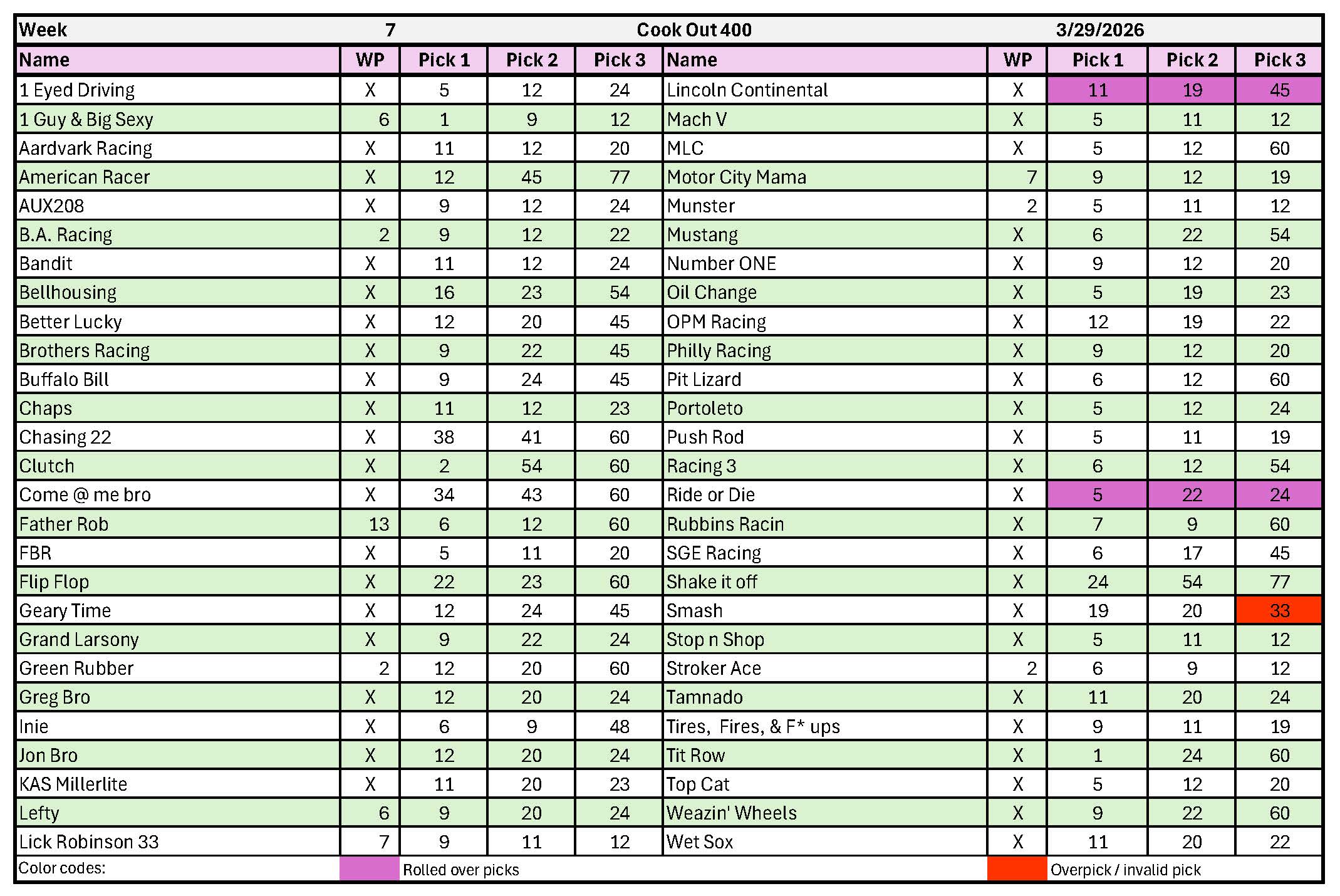 Driver Pick Sheet